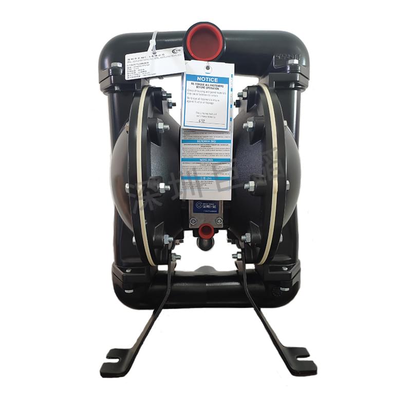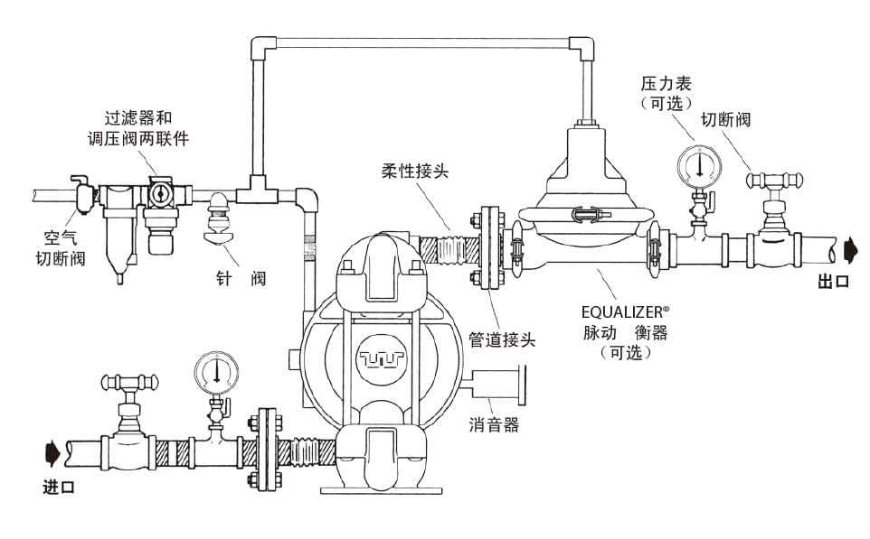 將泵安裝在平整臺(tái)面上,底腳固定,接上物料進(jìn)出管道(物料進(jìn)出口處的建議:安裝30-50CM長(zhǎng)彈性軟管(或撓性接頭)以保護(hù)泵,降低、減少震動(dòng),避免螺栓松動(dòng),造成滲漏),緊固隔膜泵上所有螺絲(防止運(yùn)輸搬動(dòng)途中造成螺栓松動(dòng)),接上氣源即可。